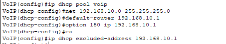 Option 150 maksudnya adalah ip TFTP Server, TFTP Server itu server yang menyimpan konfigurasi dalam hal ini yang menyman konfigurasi dial-number adalah Router maka command nya option 150 ip 192.168.10.1, dengan 192.168.10.1 adalah IP Router.